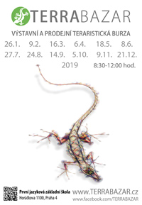 Popis: TERRABAZAR - Výstavní a prodejní teraristická burza v Praze na Pankráci s dlouholetou tradicí. Akce se koná v První jazykové základní škole, Horáčkova 1100, Praha 4, u metra Pankrác. Nejbližší termíny: 2.6., 28.7., 18.8., 15.9., 20.10., 24.11., a 22.12.2018. Vstupné od 40 Kč do 100 Kč. Akce se koná od 8:30 do 12:00 hod. a budeme rádi, když se zaregistrujete i jako prodejce na našich stránkách www.terrabazar.cz